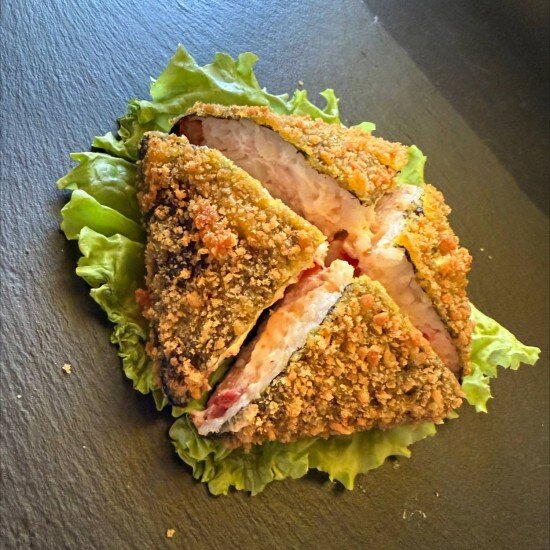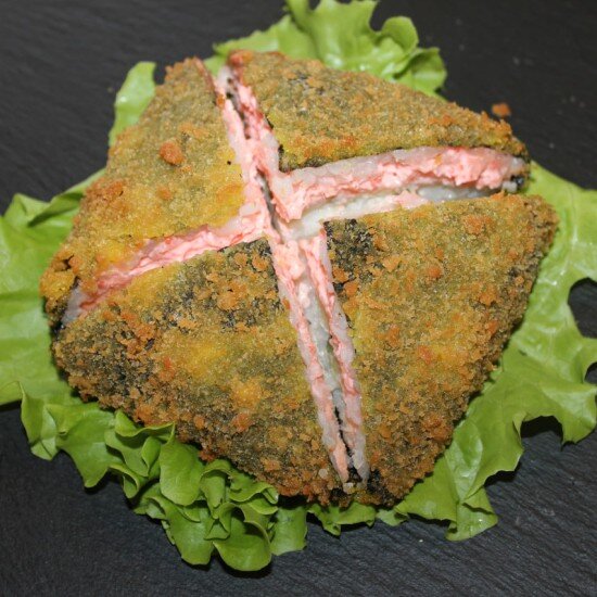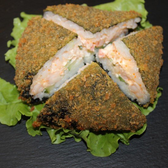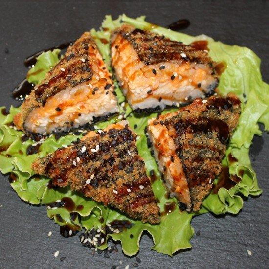 Рис, нори, куриная грудка в/к, томат, соус фреш, кляр, сухари.