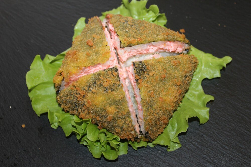 Лосось с/с, огурец, соус яки, рис, нори, кляр, сухари.