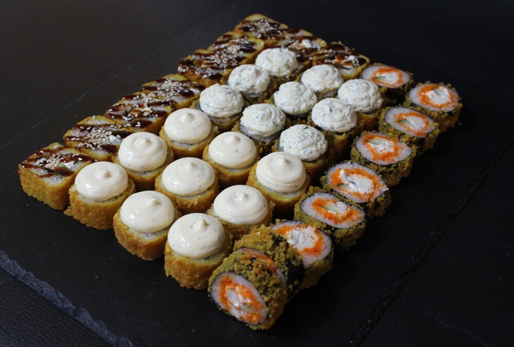 «Сушимика» 9шт, «Хот ролл Сяке» 9шт, «Хот ролл Цезарь» 9шт, «Калифорния темпура» 9шт. ИМБИРЬ, ВАСАБИ, СОЕВЫЙ СОУС И ПАЛОЧКИ В КОМПЛЕКТ НЕ ВХОДЯТ.