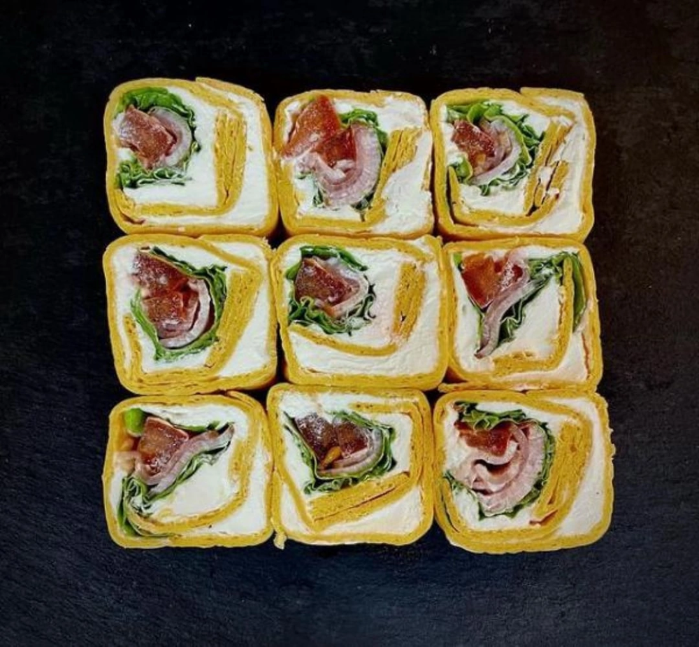 Тортилья сырная ,сливочный сыр, салат листовой, свежий томат, бекон в/к. ИМБИРЬ, ВАСАБИ, СОЕВЫЙ СОУС И ПАЛОЧКИ В КОМПЛЕКТ НЕ ВХОДЯТ.