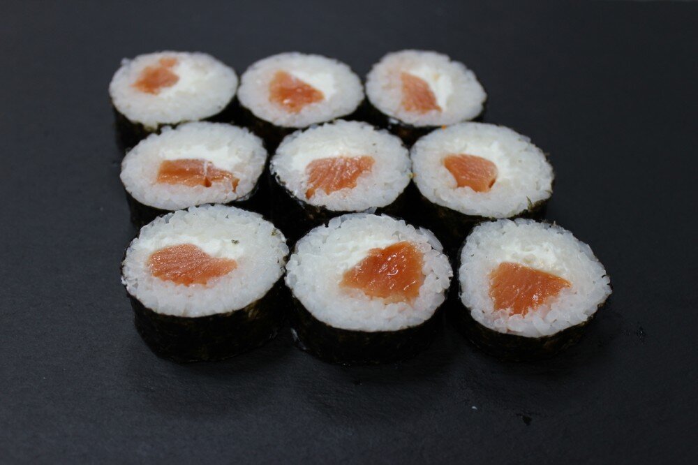 Лосось с/с, сливочный сыр, рис, нори. ИМБИРЬ, ВАСАБИ, СОЕВЫЙ СОУС И ПАЛОЧКИ В КОМПЛЕКТ НЕ ВХОДЯТ.