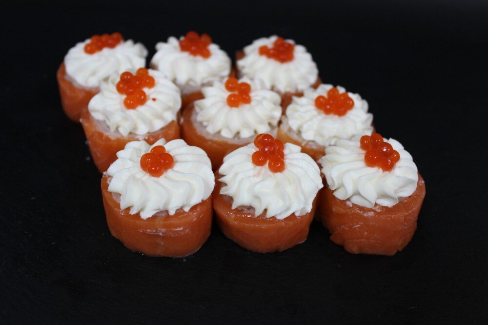 Лосось с/с, сливочный сыр, огурец, рис, нори, имитация икры лосося. ИМБИРЬ, ВАСАБИ, СОЕВЫЙ СОУС И ПАЛОЧКИ В КОМПЛЕКТ НЕ ВХОДЯТ.