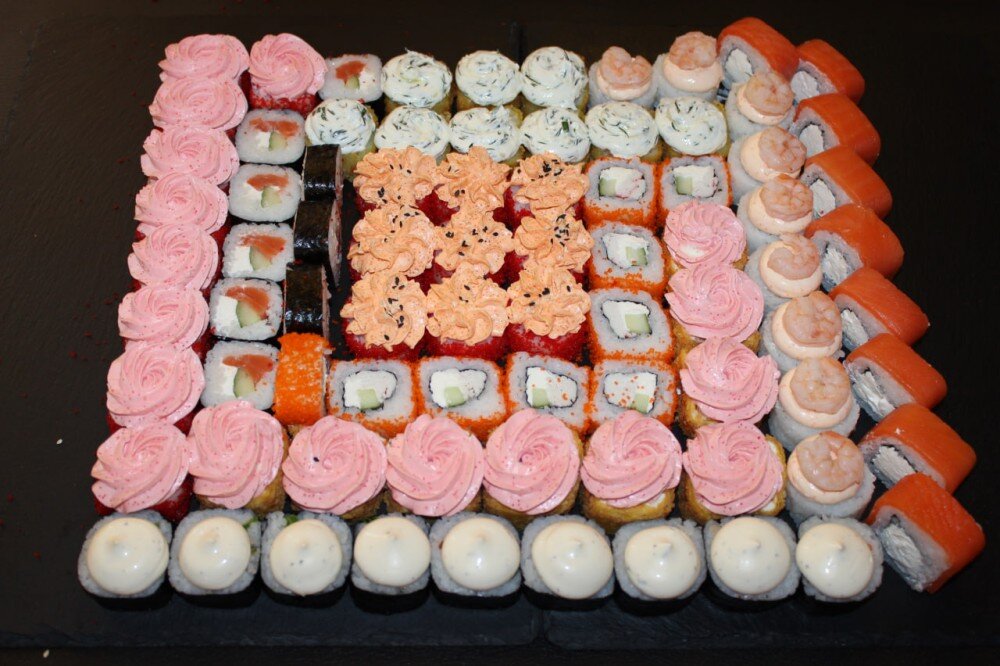 «Филадельфия» 9шт, «Лава Эби» 9шт, «Калифорния» 9шт, «Тори ролл» 9шт, «Лава масаго» 9шт, «Цезарь» 9шт, «Гейша» 9шт, «Сайтама» 9шт, «Нагасаки» 9шт. ИМБИРЬ, ВАСАБИ, СОЕВЫЙ СОУС И ПАЛОЧКИ В КОМПЛЕКТ НЕ ВХОДЯТ.