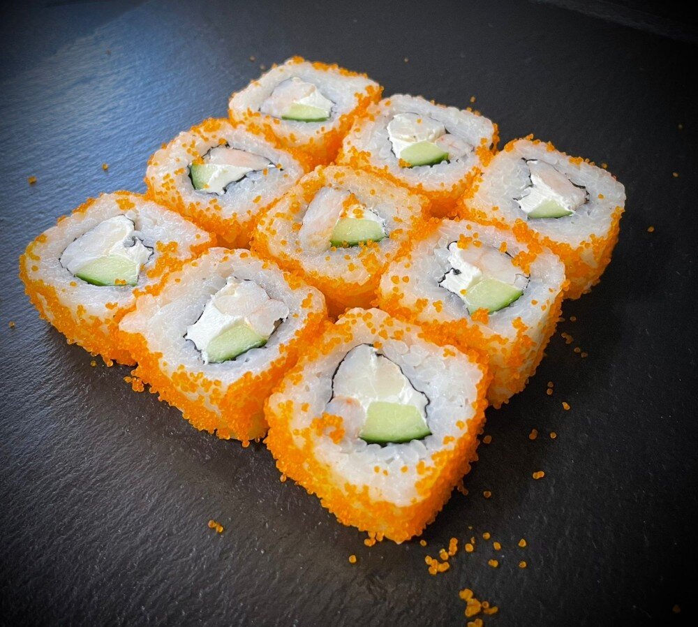 Сливочный сыр креметте, свежий огурец, креветка, икра масаго, рис, нори. ИМБИРЬ, ВАСАБИ, СОЕВЫЙ СОУС И ПАЛОЧКИ В КОМПЛЕКТ НЕ ВХОДЯТ.