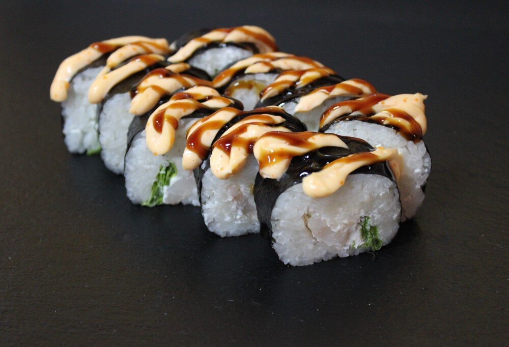 Креветка, лист салата, сливочный сыр, соус спайси, соус унаги, рис, нори. ИМБИРЬ, ВАСАБИ, СОЕВЫЙ СОУС И ПАЛОЧКИ В КОМПЛЕКТ НЕ ВХОДЯТ .