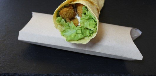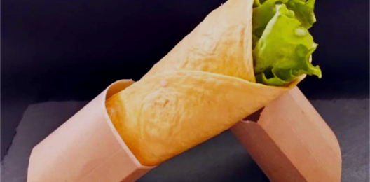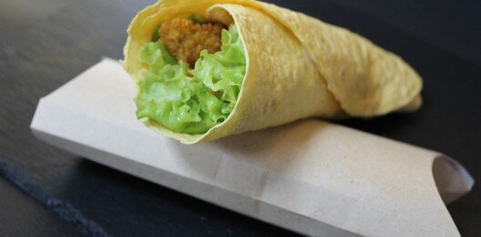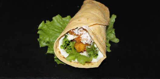 Тортилья, сыр сливочный, лист салата, креветка темпура, огурец, соус спайси.
