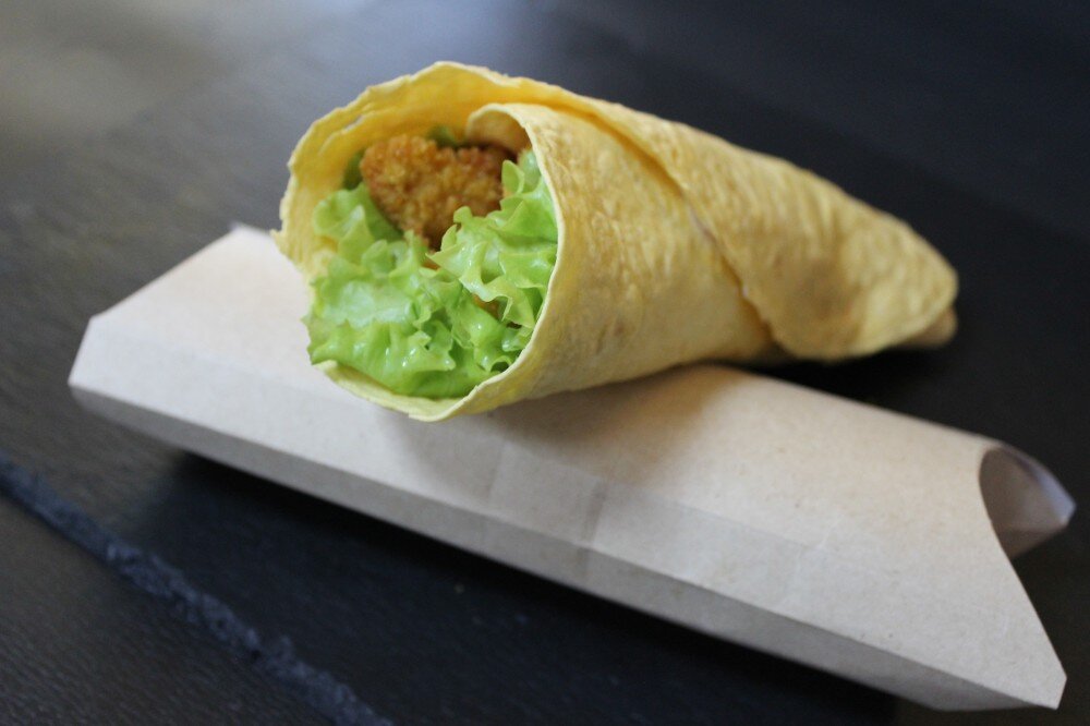 Тортилья сырная, сыр сливочный, лист салата, грудка куриная темпура,бекон в\к поджаренный, соус чесночный, острый соус шрирача.