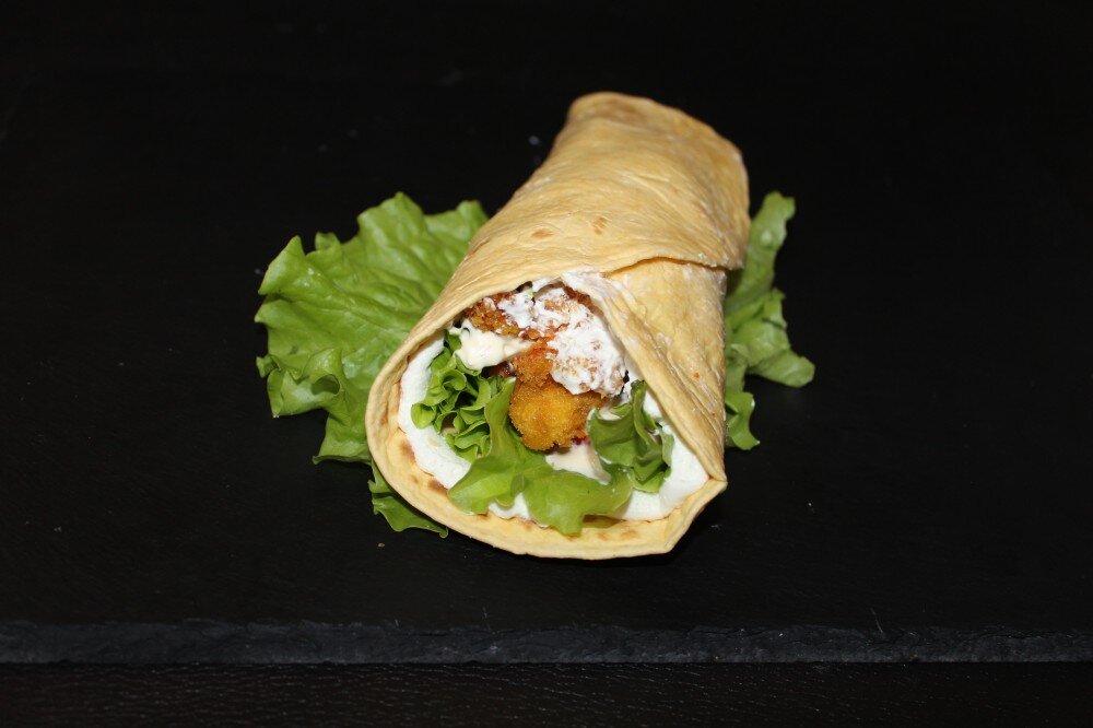Тортилья сырная, сыр сливочный, лист салата, креветка темпура, снежный краб, чесночный соус.