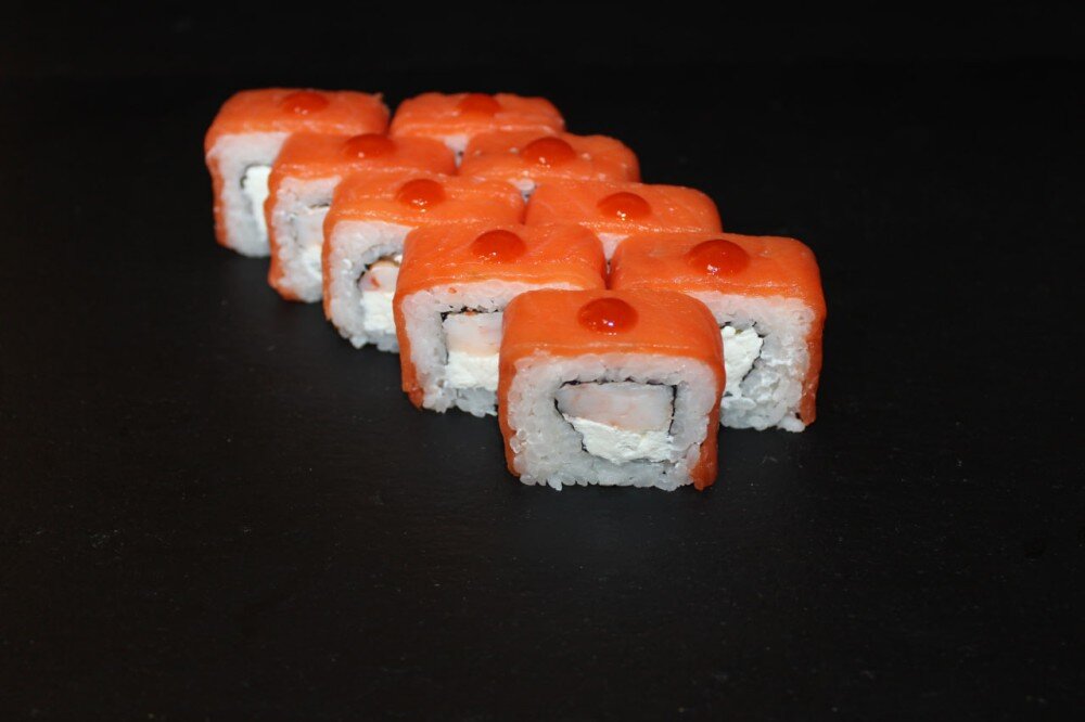 Лосось с/с, креветка, сливочный сыр, рис, нори. ИМБИРЬ, ВАСАБИ, СОЕВЫЙ СОУС И ПАЛОЧКИ В КОМПЛЕКТ НЕ ВХОДЯТ.