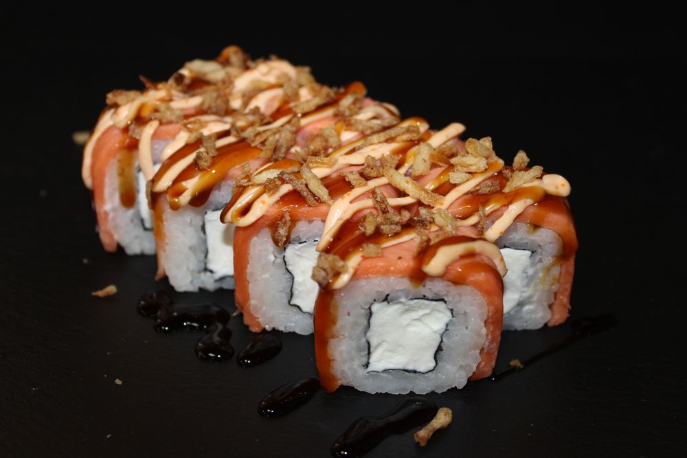 Лосось с/с, сливочный сыр,соус спайси,соус унаги, лук фри,рис, нори. ИМБИРЬ, ВАСАБИ, СОЕВЫЙ СОУС И ПАЛОЧКИ В КОМПЛЕКТ НЕ ВХОДЯТ.