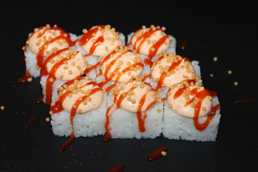 Креветка, сливочный сыр, соус спайси , соус шрирача , рисовые шарики tom yum, рис, нори. ИМБИРЬ, ВАСАБИ, СОЕВЫЙ СОУС И ПАЛОЧКИ В КОМПЛЕКТ НЕ ВХОДЯТ.
