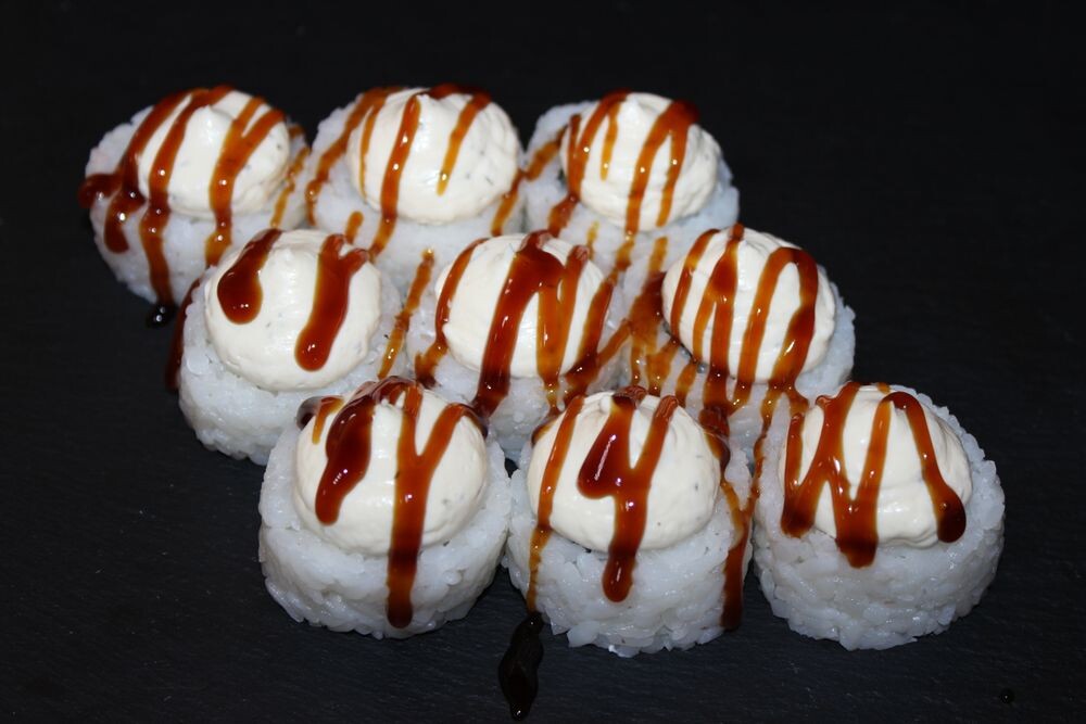 Курица в\к , сливочный сыр, огурец, соус цезарь , соус унаги , рис, нори. ИМБИРЬ, ВАСАБИ, СОЕВЫЙ СОУС И ПАЛОЧКИ В КОМПЛЕКТ НЕ ВХОДЯТ.