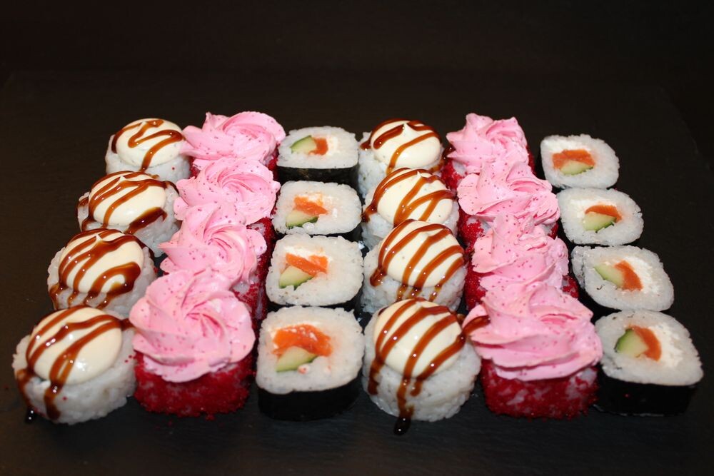 «Гейша» 8шт, «Унаги цезарь» 8шт, «Лава Масаго» 8шт. ИМБИРЬ, ВАСАБИ, СОЕВЫЙ СОУС И ПАЛОЧКИ В КОМПЛЕКТ НЕ ВХОДЯТ.