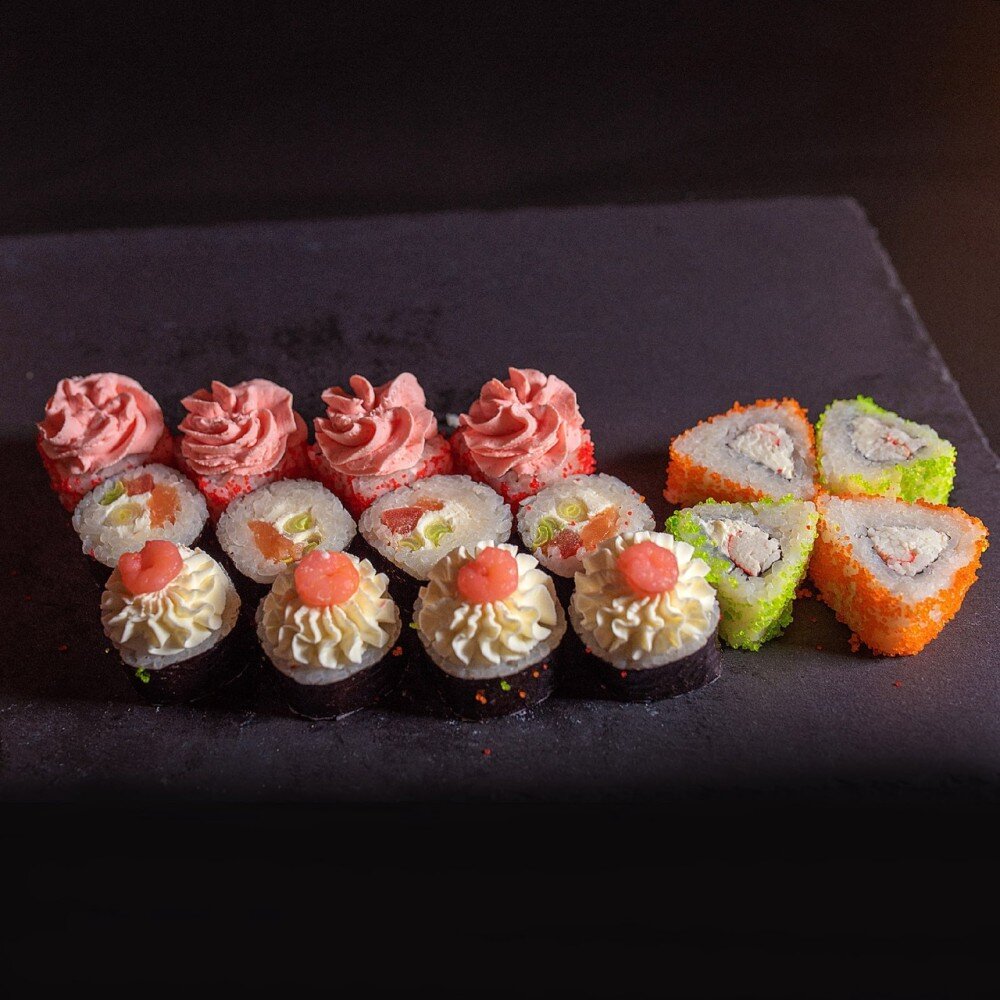«Лава масаго» 4шт, «Мизу маки» 4шт, «Ниппан» 4шт, «Сливочный эби маки» 4шт. ИМБИРЬ, ВАСАБИ, СОЕВЫЙ СОУС И ПАЛОЧКИ В КОМПЛЕКТ НЕ ВХОДЯТ.