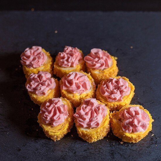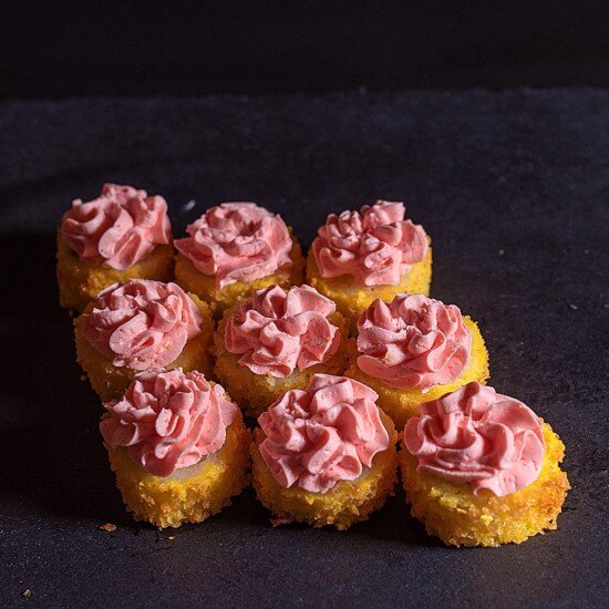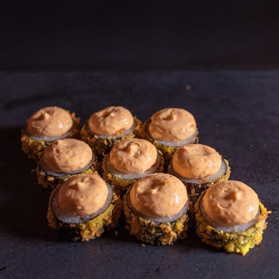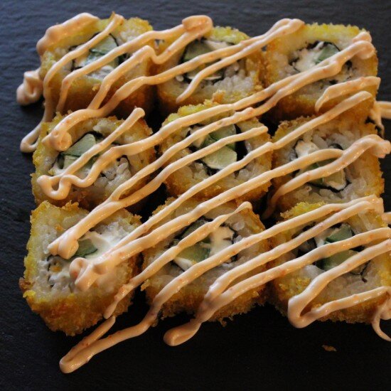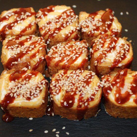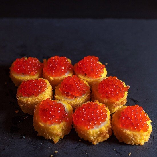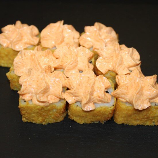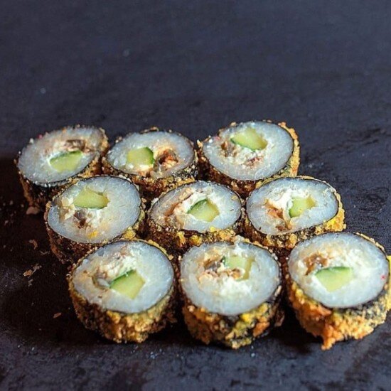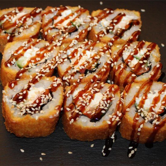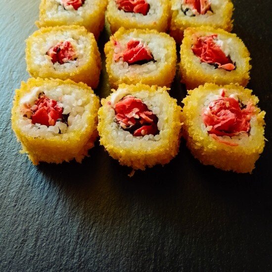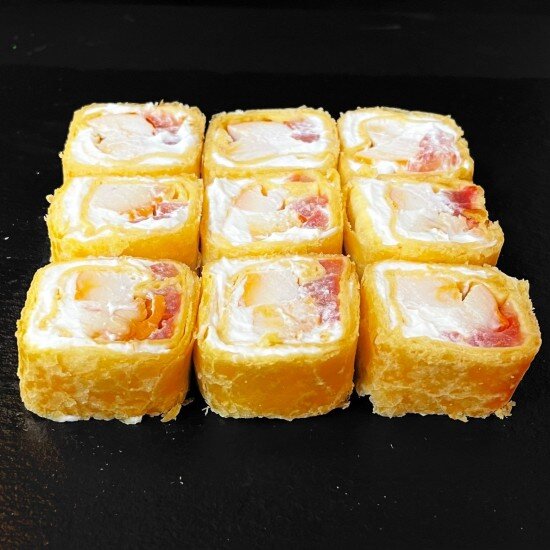 Сливочный сыр, куриная грудка в/к, бекон в/к, лист салата, зелёный лук, рис, нори, обжаренные в сухарях. ИМБИРЬ, ВАСАБИ, СОЕВЫЙ СОУС И ПАЛОЧКИ В КОМПЛЕКТ НЕ ВХОДЯТ.