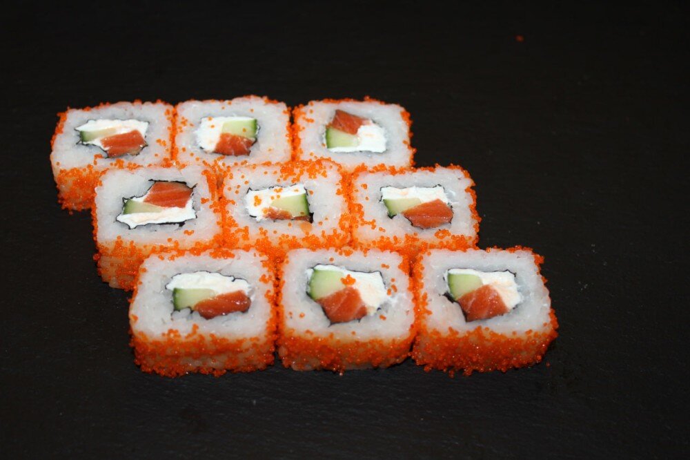 Лосось с/с, огурец, сливочный сыр, икра масаго, рис, нори. ИМБИРЬ, ВАСАБИ, СОЕВЫЙ СОУС И ПАЛОЧКИ В КОМПЛЕКТ НЕ ВХОДЯТ.