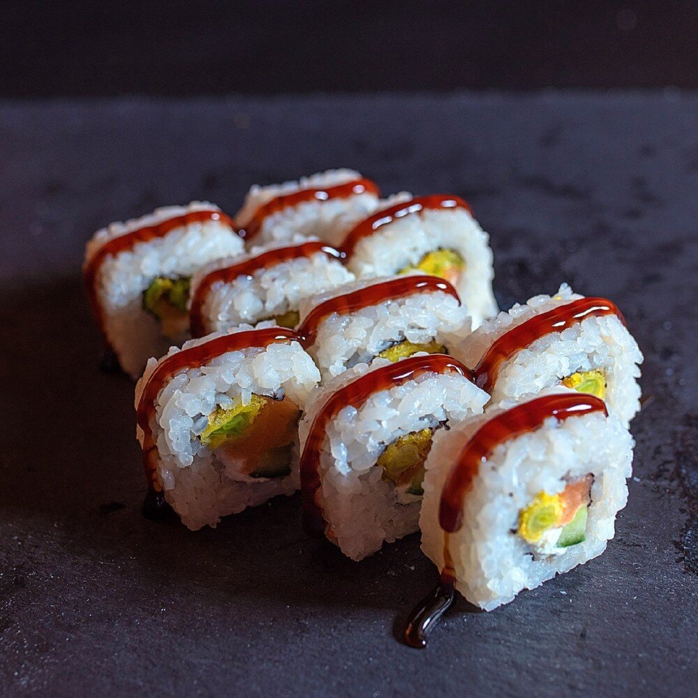 Лосось с/с, сливочный сыр, огурец, лук темпура, соус терияки, рис, нори. ИМБИРЬ, ВАСАБИ, СОЕВЫЙ СОУС И ПАЛОЧКИ В КОМПЛЕКТ НЕ ВХОДЯТ.