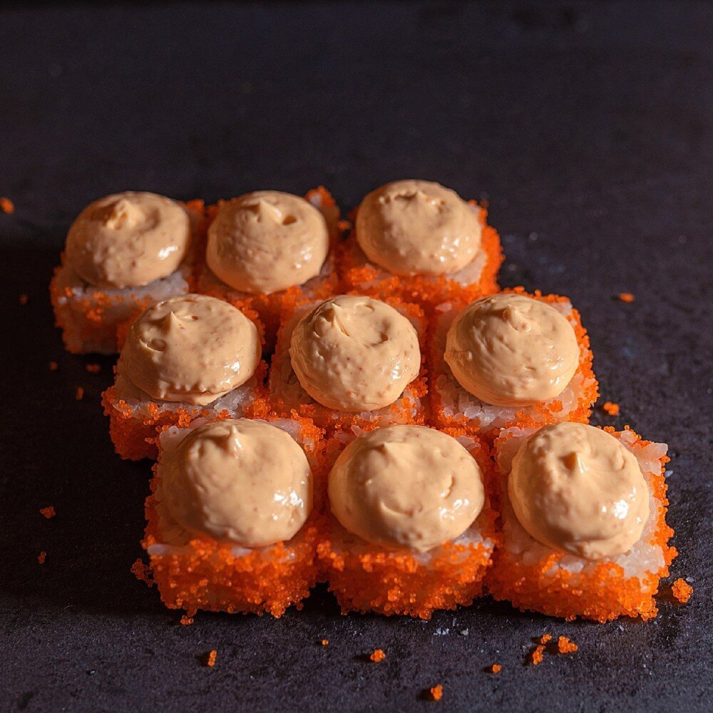 Лосось с/с, сливочный сыр, имитация краба, соус спайси, рис, нори. ИМБИРЬ, ВАСАБИ, СОЕВЫЙ СОУС И ПАЛОЧКИ В КОМПЛЕКТ НЕ ВХОДЯТ.