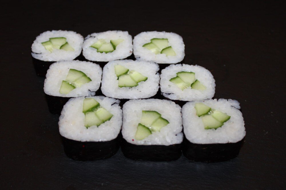 Огурец, кунжут, рис, нори. ИМБИРЬ, ВАСАБИ, СОЕВЫЙ СОУС И ПАЛОЧКИ В КОМПЛЕКТ НЕ ВХОДЯТ.