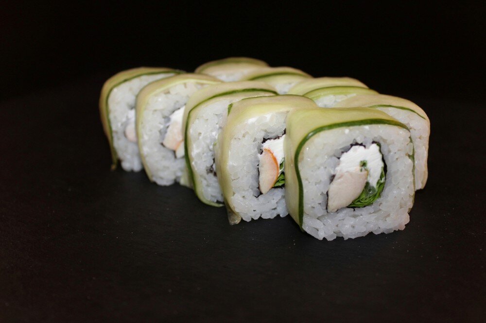 Огурец, сливочный сыр, куриная грудка в/к, лист салата, рис, нори. ИМБИРЬ, ВАСАБИ, СОЕВЫЙ СОУС И ПАЛОЧКИ В КОМПЛЕКТ НЕ ВХОДЯТ.