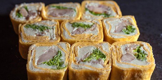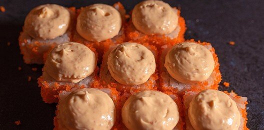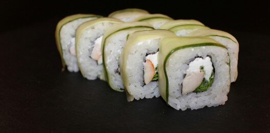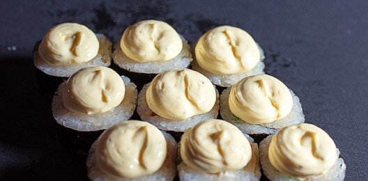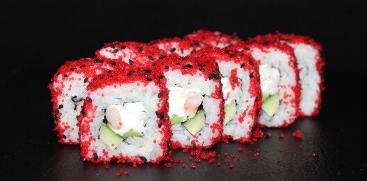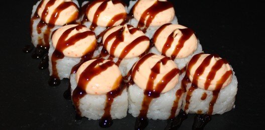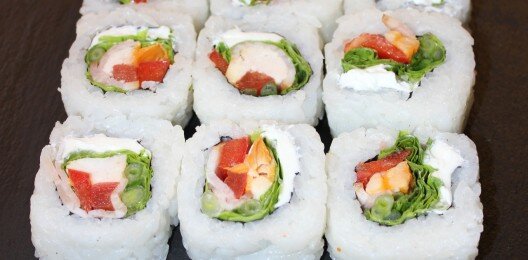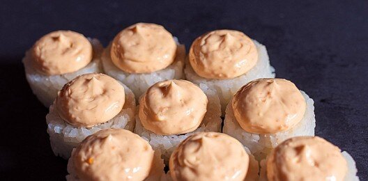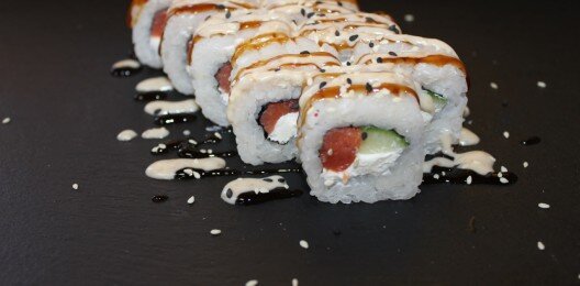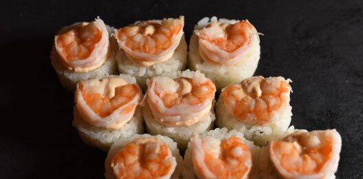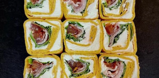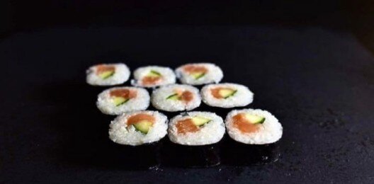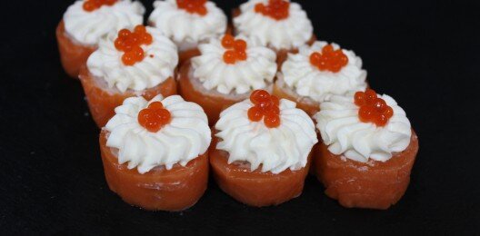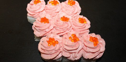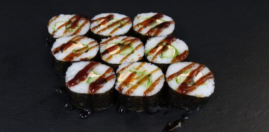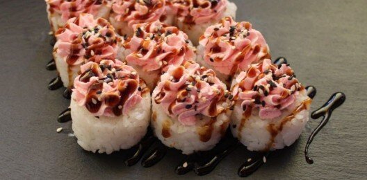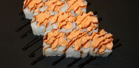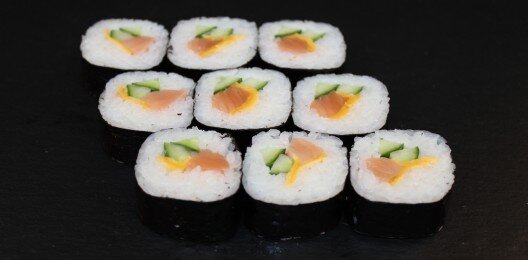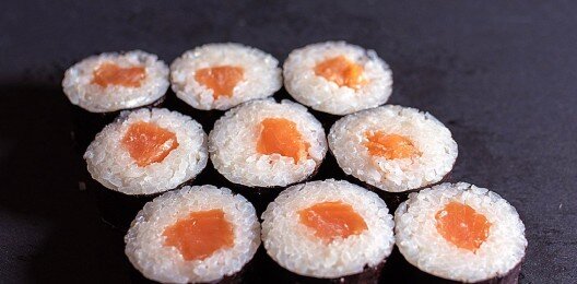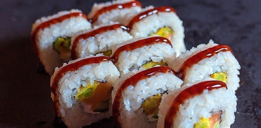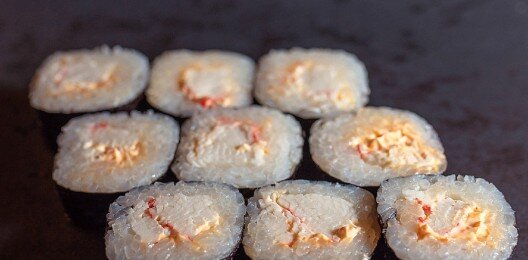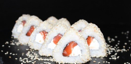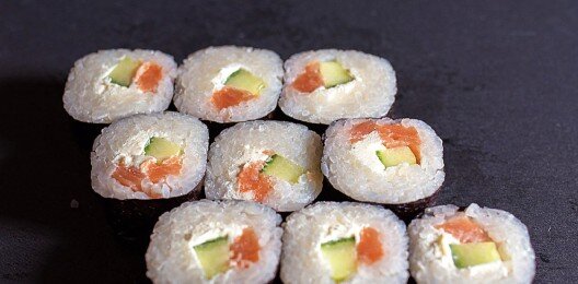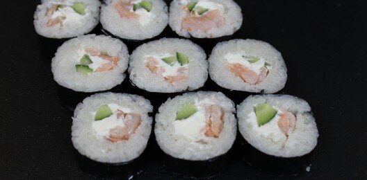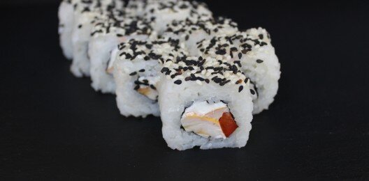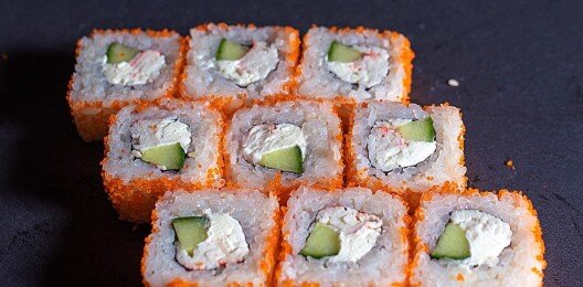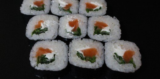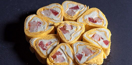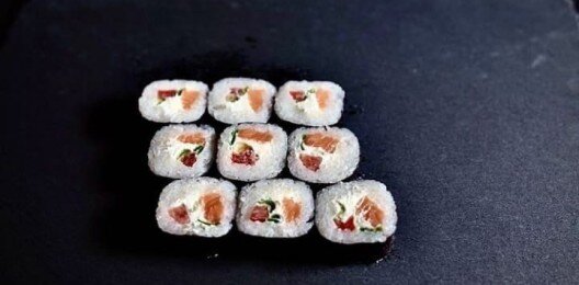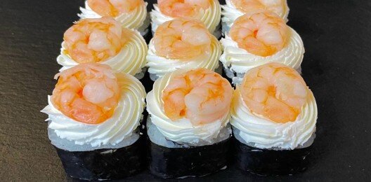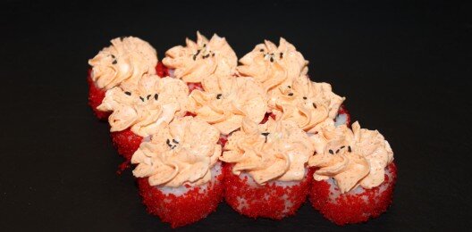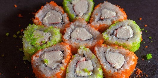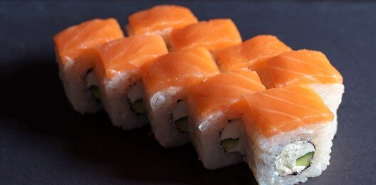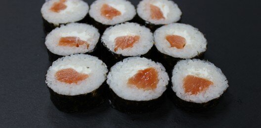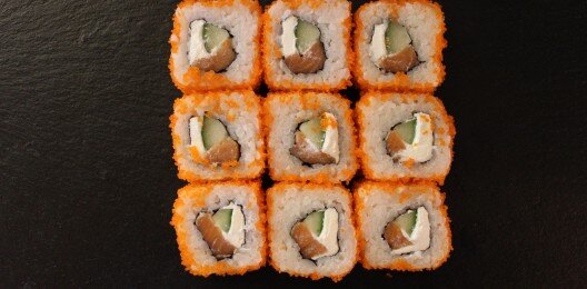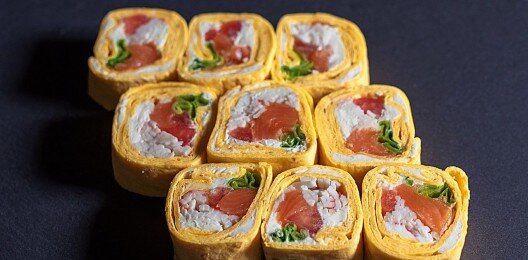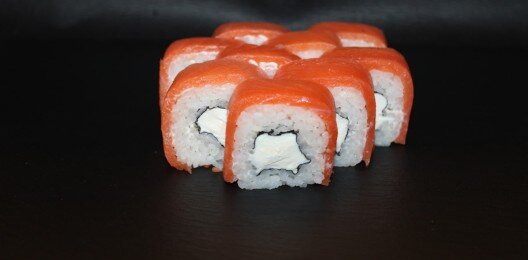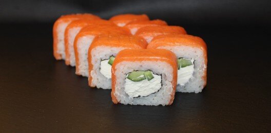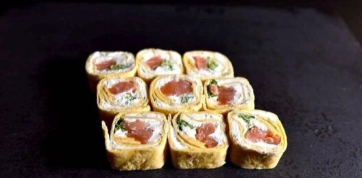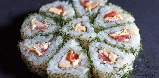 Бекон в/к, сливочный сыр, свежий томат, лосось с/с, рис, нори. ИМБИРЬ, ВАСАБИ, СОЕВЫЙ СОУС И ПАЛОЧКИ В КОМПЛЕКТ НЕ ВХОДЯТ.