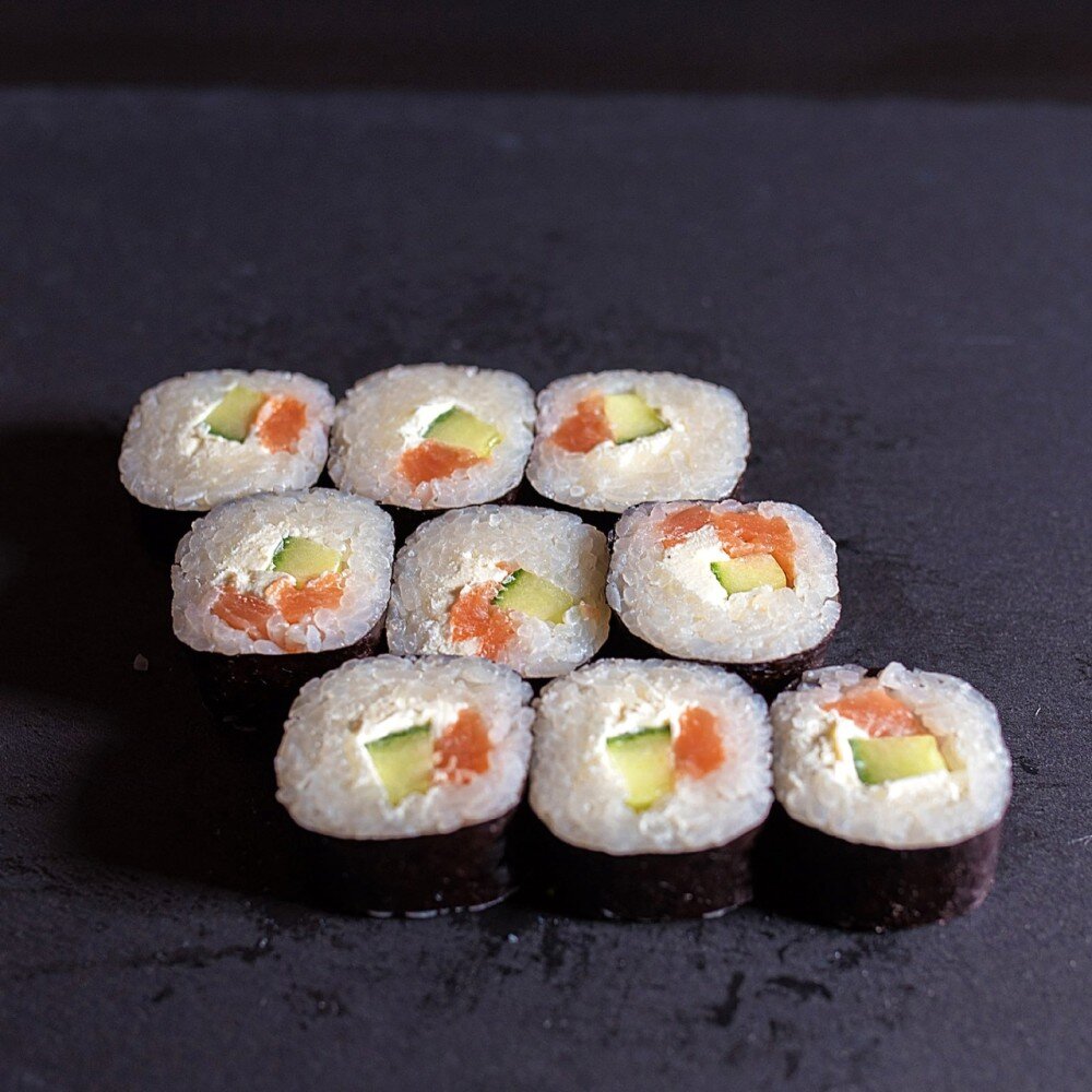 Лосось с/с, сливочный сыр, свежий огурец, рис, нори. ИМБИРЬ, ВАСАБИ, СОЕВЫЙ СОУС И ПАЛОЧКИ В КОМПЛЕКТ НЕ ВХОДЯТ.