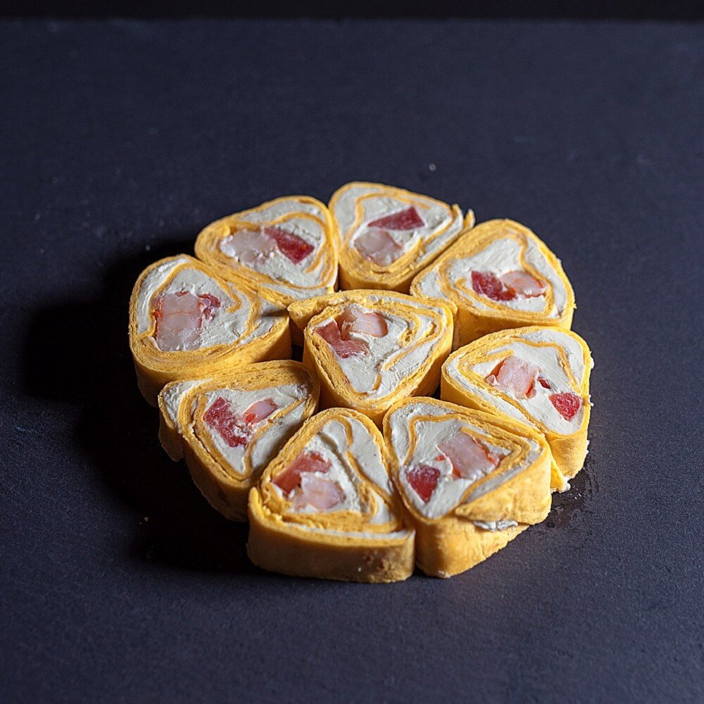 Креветка, сливочный сыр, томат, мексиканская сырная тортилья. ИМБИРЬ, ВАСАБИ, СОЕВЫЙ СОУС И ПАЛОЧКИ В КОМПЛЕКТ НЕ ВХОДЯТ.