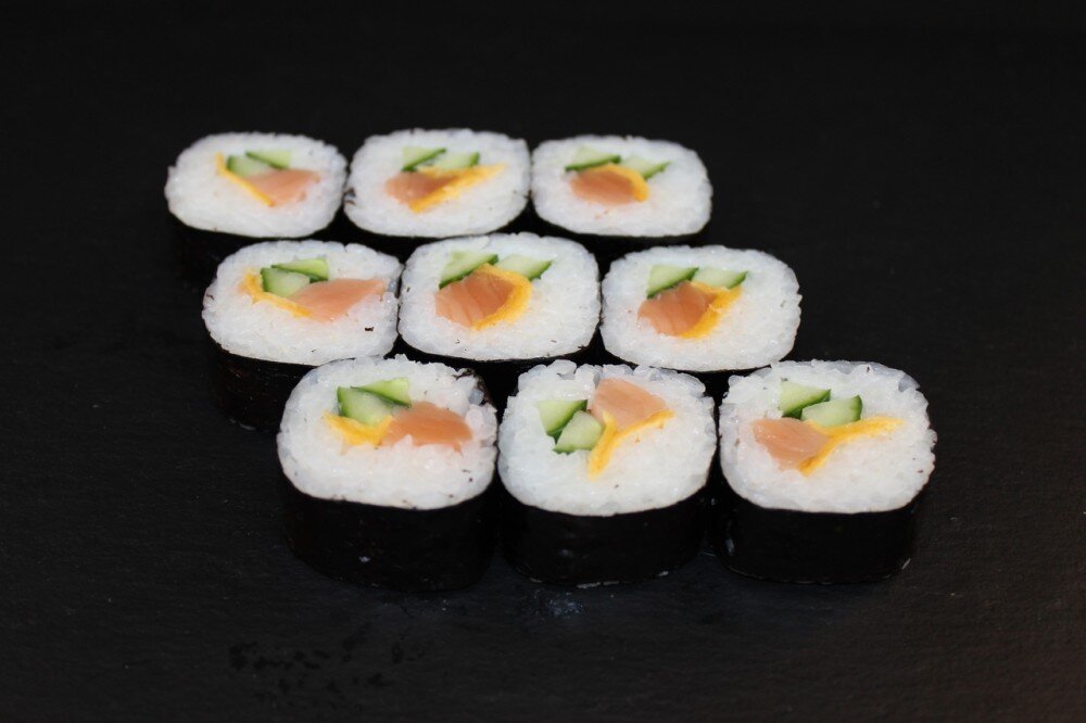Лосось с/с, японский блин, огурец, рис, нори. ИМБИРЬ, ВАСАБИ, СОЕВЫЙ СОУС И ПАЛОЧКИ В КОМПЛЕКТ НЕ ВХОДЯТ.