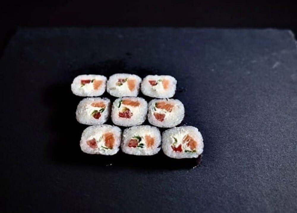 Сливочный сыр, томат, лосось с/с, зелёный лук, рис, нори. ИМБИРЬ, ВАСАБИ, СОЕВЫЙ СОУС И ПАЛОЧКИ В КОМПЛЕКТ НЕ ВХОДЯТ.